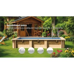Investiere in einen hochwertigen Holzpool zu einem unschlagbaren Preis mit dem spektakulären Rechteckigen Pool Papaya aus Holz 520x320x133 cm von Gre und all seinen Nutzungsvorteilen. Ein echter Holzpool, mit idealen Maßen für dein Zuhause und allem, was für die grundlegende Pflege und Nutzung erforderlich ist. Das Set enthält: 1 Papaya-Pool aus Holz. PVC-Liner, Stärke 60/100, mit spezieller UV-Schutzbehandlung. Sandfilteranlage mit einer Leistung von 6.000 l/h inklusive Filtersand. Leiter mit Holzdesign außen und Edelstahl innen. Schutzmatte, 200 g/m². Metallblenden, doppelte Umrandungen (14,5 cm x 2 = 29 cm), Stärke 2,8 cm, Nut-Feder-Verbindung 14,5 cm, Holzstärke 46 mm. Interessante Informationen zum Artikel: Empfohlenes Alter für die Nutzung: ab 6 Jahren. Ungefähre Maße des Pools: 520 cm Länge x 320 cm Breite x 133 cm Höhe. Ungefähre Innenmaße: 473 cm Länge x 282 cm Breite x 130 cm Höhe (Wasserlinie bei 120 cm). Mindestplatzbedarf für die Installation: 582 cm Länge x 391 cm Breite x 17 cm Tiefe (3,87 m³). Ungefähre Wasserkapazität: 15.400 Liter. Ungefähres Gewicht ohne Wasser: 1.599 kg. Metallkeil, Betonplatte obligatorisch.